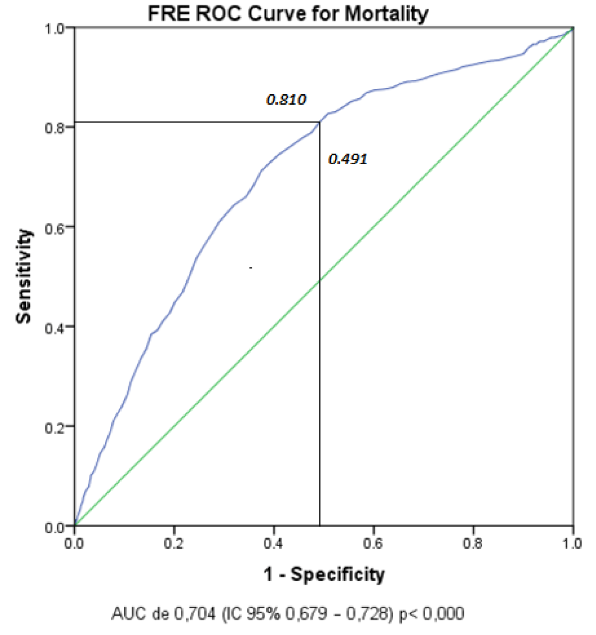 Figure 2: FRE ROC curve for Mortality. For the evaluation of the FRE cut-off point we perform a ROC curve to identify the area under the curve, which can be observed at the junction of coordinates, for a cut-off point of > 45.